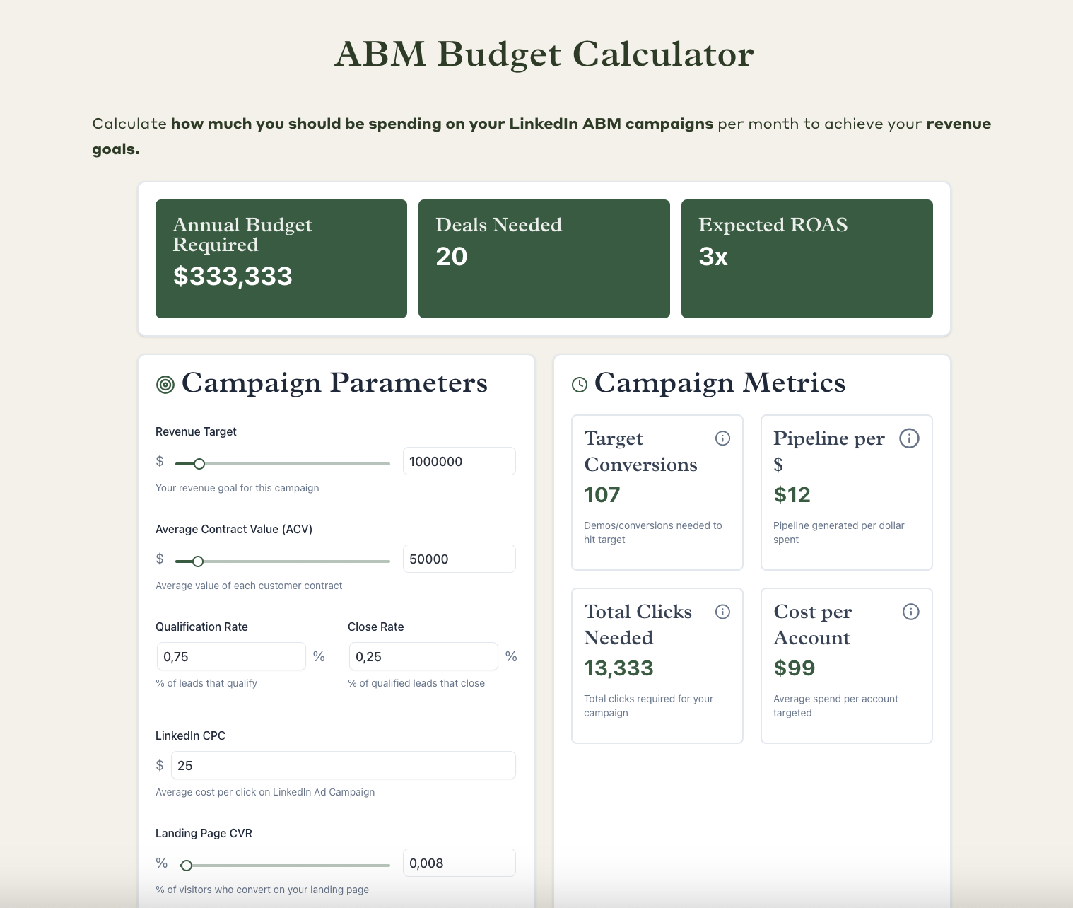 This is of course a very good question. If you’re starting your ABM campaign – you don’t want to just “spend money and see how it goes” – your manager/ CEO/ board will likely *not* give you any budget to spend if you can’t project any results 🫠 but then again – how do you project results if you don’t have any previous experience? 😬 Sounds like catch 22? Well, luckily there *is* a way to estimate how much ABM budget you need to achieve a specific revenue goal with your target audience on LinkedIn.